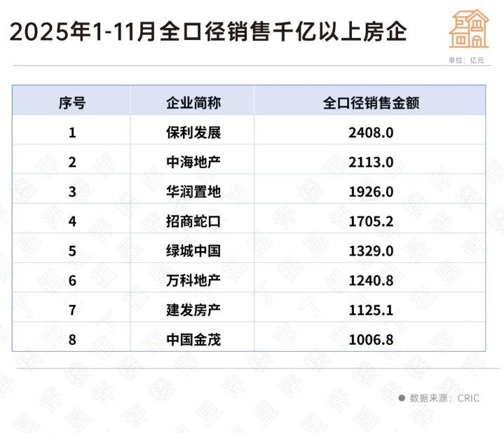 从千亿房企阵营来看,前11月有8家房企全口径销售金额破千亿,分别是保利发展、中海地产、华润置地、招商蛇口、绿城中国、万科地产、建发房产和中国金茂。另外,中国金茂前11月累计全口径销售金额较去年同期实现正增长。