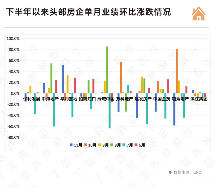 比如保利、中海、绿城、万科、建发和金茂,自6月以来均有四个月实现单月业绩环比上涨。这意味着,在行业整体承压的背景下,头部企业仍具有持续经营的韧性。